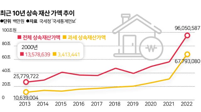 29일 한국일보가 국세청 '국세통계연보'를 분석한 결과, 2022년 상속·증여 재산 규모는 188조4,214억 원으로 2013년(57조4,638억 원)에 비해 3배 뛰었다. 이 중 과세 대상으로 각종 공제를 거쳐 최종 결정된 세액은 같은 기간 5조4,926억 원(2013년)에서 27조6,636억 원(2022년)으로 크게 증가했다. 고 이건희 삼성전자 회장의 유족이 신고한 12조 원에 달하는 상속세가 2022년에 귀속된 점을 감안해도 증가세가 뚜렷하다.