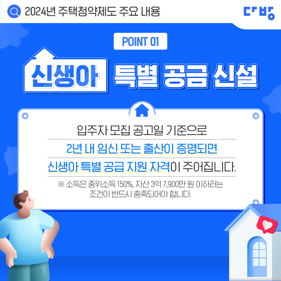 주택청약 제도 내 신설된 신생아 특별공급은 혼인 여부와 관계없이 자녀가 있는 가정에 청약 지원 기회를 제공합니다. 입주자 모집 공고일 기준 2년 내 출산 혹은 임신 증명이 가능할 경우 청약 자격을 얻을 수 있는데요, 청약제도 개편을 통해 중위소득 150% 이하 가구에 혜택이 주어집니다.