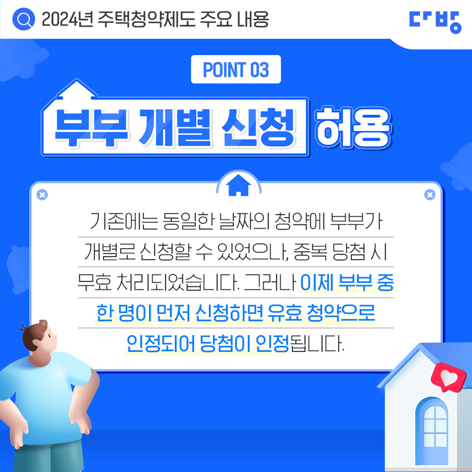 기존 주택청약 제도는 부부가 반드시 함께 청약을 신청해야 했으나, 2024년 청약제도 개편 이후부터는 개별 신청이 허용되고 있습니다. 이제 부부 중 한 명만 신청해도 청약이 유효하며, 중복 당첨이 되어도 무효 처리되지 않고 한 사람의 청약으로 인정되는 것인데요. 특히, 과거 부부 개별 신청 인정이 되지 않던 시기, 청약 혜택을 유지하기 위해 혼인신고 없이 함께 생활하던 부부들에게는 무척 중요한 개편 사항이 될 수 있습니다.