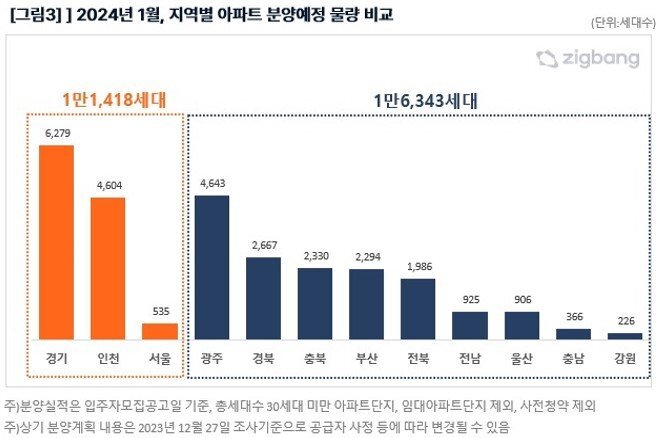 ()직방(대표 안성우)이 조사한 2024 1월 분양예정 물량은 39개 단지,  27,761세대로 조사됐다. 일반분양 규모는 22,237세대다. 전년 동월(1,708세대) 대비 16.2 많은 물량으로 분양가나 입지에 따른 양극화 현상이 두드러지고 있는 가운데 갑진년 첫 달부터 상당한 물량이 공급될 예정이다.