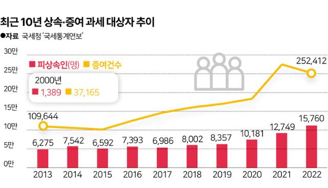 상속·증여세 납부 건수 자체가 늘고 있다는 분석이 뒤따른다. 2022년 1만5,760명으로 집계된 과세 대상 피상속인 수는 마지막으로 과표 구간을 조정한 2000년(1,389명)에 비하면 11배 많아졌다. 비율로 따져도 상속이 발생했을 때 상속세를 내야 하는 사람 비중은 같은 기간 0.7% 수준에서 4.5%로 높아졌다. 증여세 과세 건수 역시 3만7,165건에서 25만2,412건으로 급증했다. 국세청 관계자는 "부동산 등 시장 활성화로 자산가치가 상승하면서 과세 대상과 세수가 늘어나는 경향이 큰 것으로 보고 있다"고 설명했다.