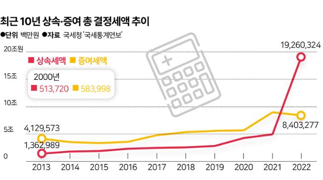 29일 한국일보가 국세청 '국세통계연보'를 분석한 결과, 2022년 상속·증여 재산 규모는 188조4,214억 원으로 2013년(57조4,638억 원)에 비해 3배 뛰었다. 이 중 과세 대상으로 각종 공제를 거쳐 최종 결정된 세액은 같은 기간 5조4,926억 원(2013년)에서 27조6,636억 원(2022년)으로 크게 증가했다. 고 이건희 삼성전자 회장의 유족이 신고한 12조 원에 달하는 상속세가 2022년에 귀속된 점을 감안해도 증가세가 뚜렷하다.