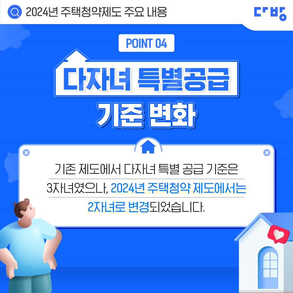 출산 장려를 위해 다자녀 특별공급 기준이 2자녀로 완화되었습니다. 기존 3자녀 이상일 경우에만 자격을 얻을 수 주택청약 제도와 달리, 자격 요건을 2자녀로 낮췄기 때문에 다자녀 가구에 대한 청약 기회 확대는 물론, 생활 안정성 또한 지원하게 되었습니다.