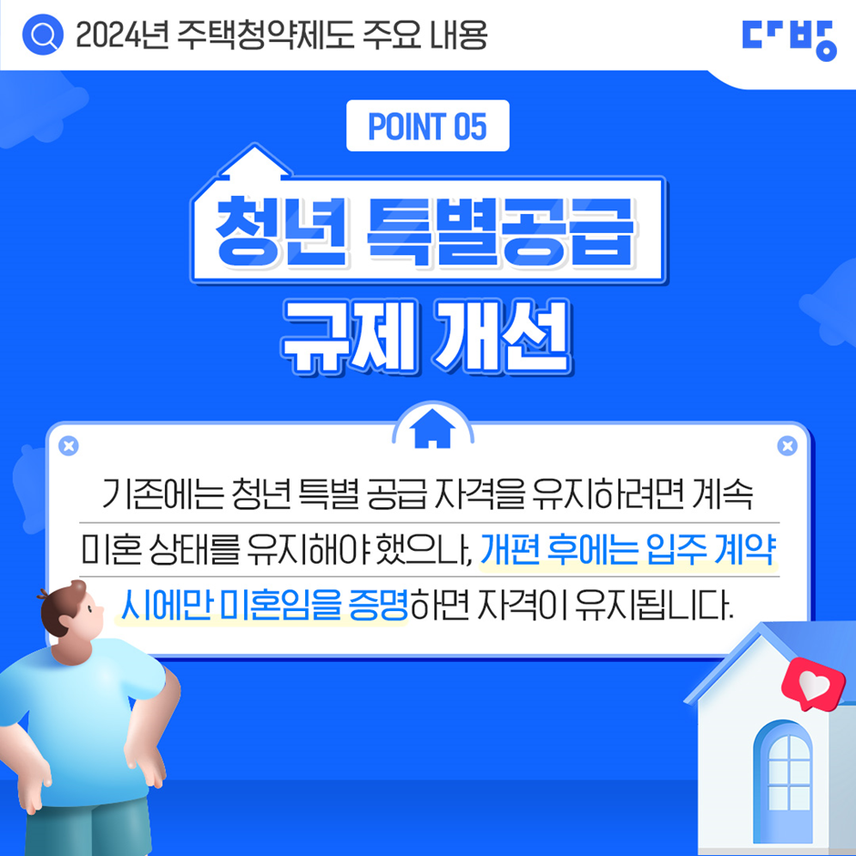 청년 특별공급 청약 규제도 청약제도 개편과 함께 개선되었습니다. 기존에는 입주와 재계약 시까지 미혼이어야 했지만, 개편된 주택청약제도 규정에 따라 입주 계약 시에만 미혼임을 증명하면 자격을 유지할 수 있습니다.
