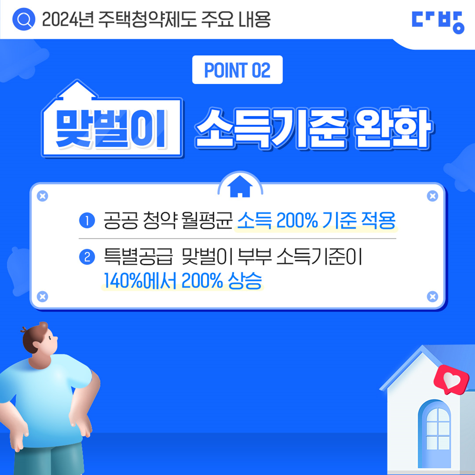 맞벌이 가구의 소득기준이 완화되어, 공공주택 청약 시 맞벌이 가구의 월 소득 200%까지 인정됩니다. 민간주택 주택청약 제도는 기존 소득 제한이 없는 추첨제가 유지되는 한편, 특별공급은 추첨제로 200%까지 신청이 가능해졌기 때문에 맞벌이 가구의 부담이 줄어들 것으로 예상됩니다.