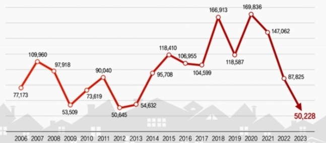 2006~2023년 1월전국 주택거래량 추이 [사진 = 한국부동산원]올해 1월 전국 주택 거래량이 역대 가장 적은 것으로 나타났다. 높은 수준의 금리와 주택 가격 하락세로 인해 얼어붙은 주택 매수심리가 좀처럼 살아날 기미를 보이지 않고 있다.